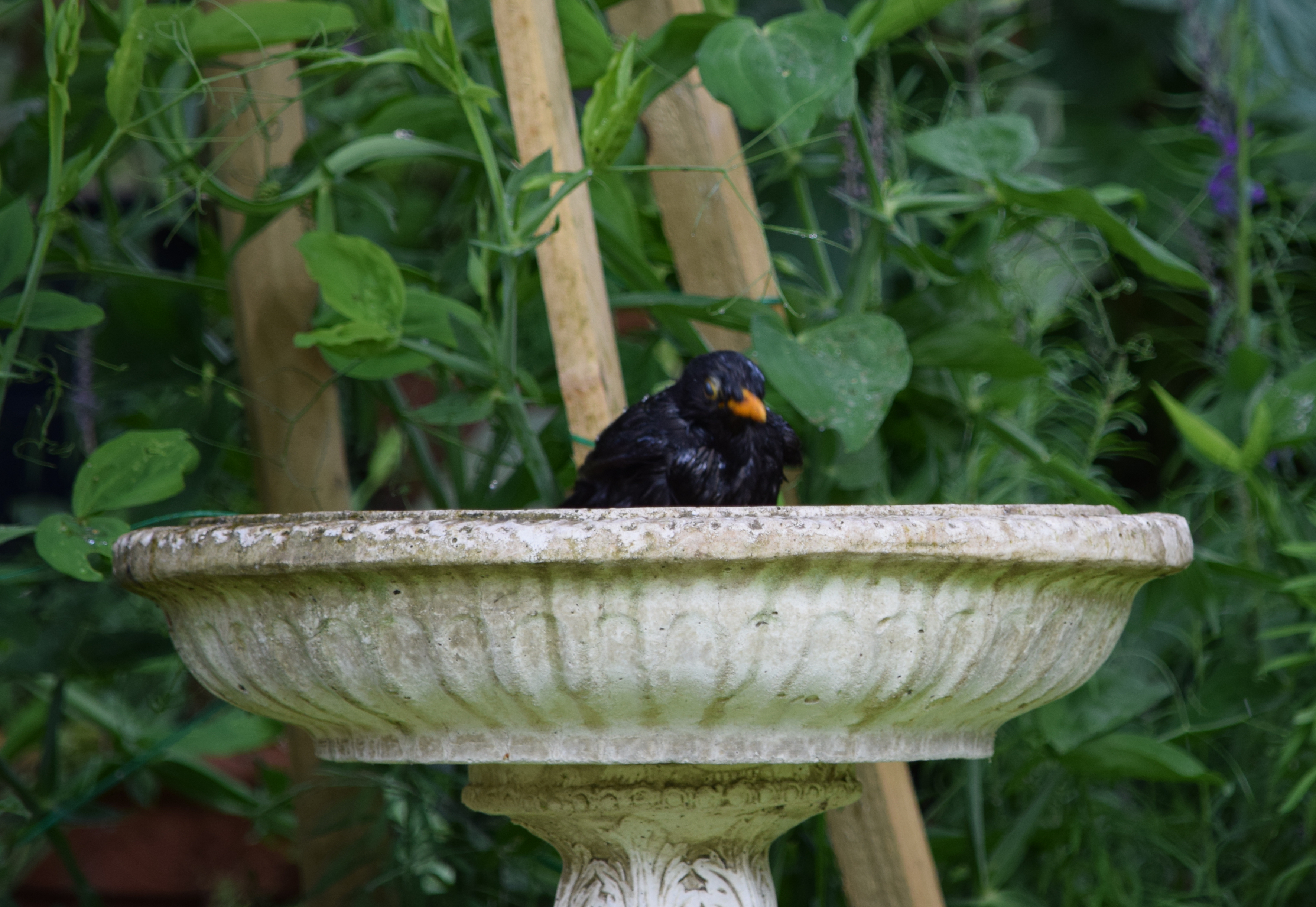 That was Mr. Flora’s Patch’s verdict on the general usefulness of a birdbath. Eventually he gave in, probably because it was easier. On a sale day at the garden centre, I got my birds a bath and proudly installed it by the birch tree where the feeders hang. We filled it with water and sat in the patio, with an anticipatory stance that was probably enough to scare the birds away even if the new, unfamiliar structure wasn’t going to.