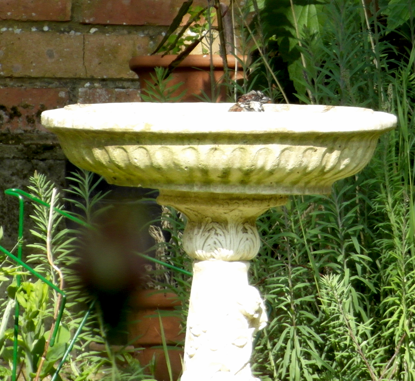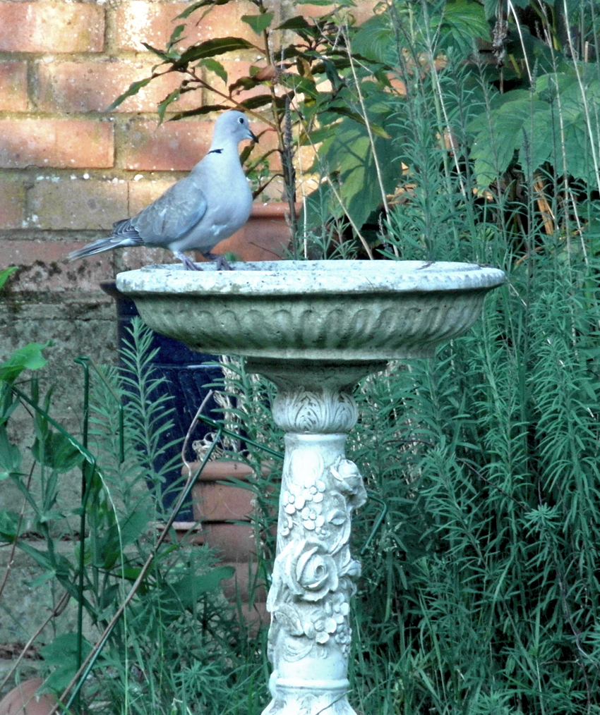 The graceful dove and the clumsy pigeonThe prettiest bathers have to be the collared doves. They sit on the ledge and try one foot first. They look like a 1920s young lady in a rather stylish pale grey bathing costume with a little black collar for good effect, extending her pointed toes to test the temperature before risking a full bath. Compared to the fat pigeon who lands straight in the centre with a big flop that sends the water over the edge, the collared doves are the most graceful creatures on Earth. When several visit together and sit around the edge, they look like a live incarnation of Pliny’s doves. It is magical.