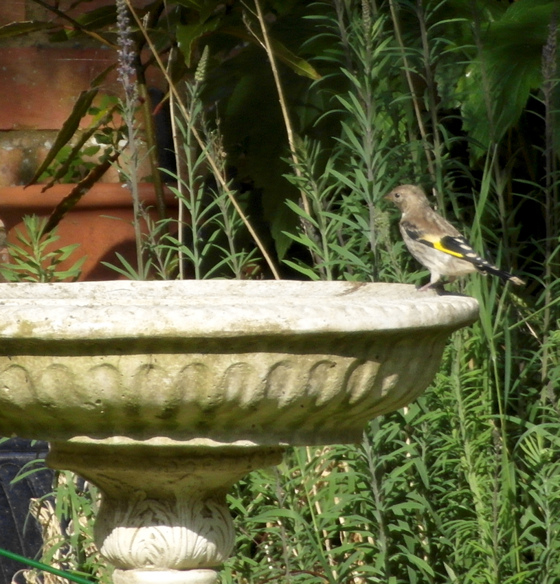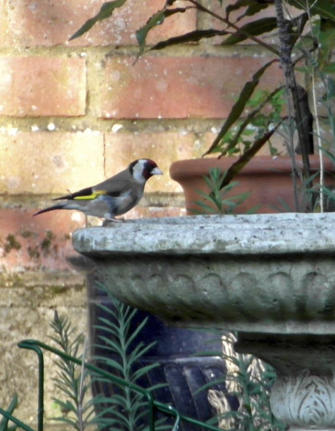 Yesterday for the first time the birdbath was invaded by a flock of goldfinches, chatting away noisily as they shared the pool Roman style, on what looked like an organised spa day trip for small colourful birds. Unfortunately they were moving so fast that I never managed to get a single picture of the group in focus. I expect that their exciting chattering could be heard in a two-mile radius.