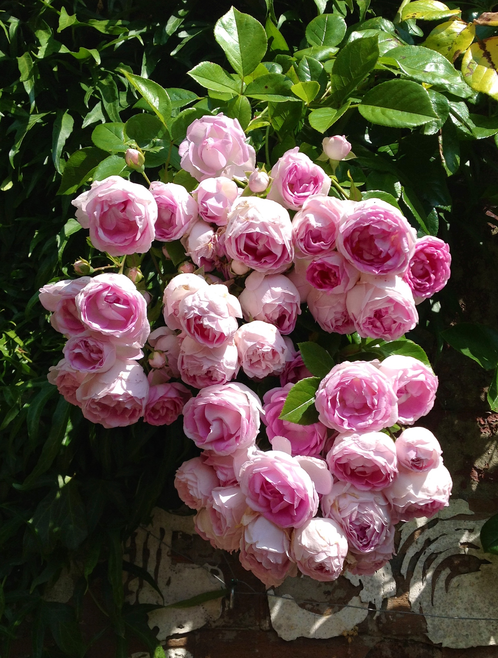 There are many reasons for my liking this rose so much: the pale, delicate pink blush is the very picture of an English rose; the profusion of luminous blooms brightens up the patio, even in the shade; the sweet perfume is dizzying; the flowering goes on all summer, as long as I deadhead regularly and trim the long shooting arches; the sparrows love to play hide and seek in the tight foliage, feeling protected by the thorns and the intricate network of branches.