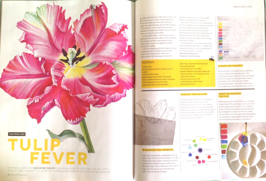 The April issue of A&I Magazine is out, with my Apricot Tulip Masterclass on a 4 page spread. I always find it exciting to see my paintings published…