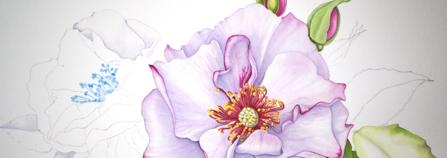 With all the roses in the garden, it was only a mater of minutes before I succumbed to the urge of painting one of them. I chose ‘Odyssey’, a pale lilac open rose with large blooms and lovely perfume.
