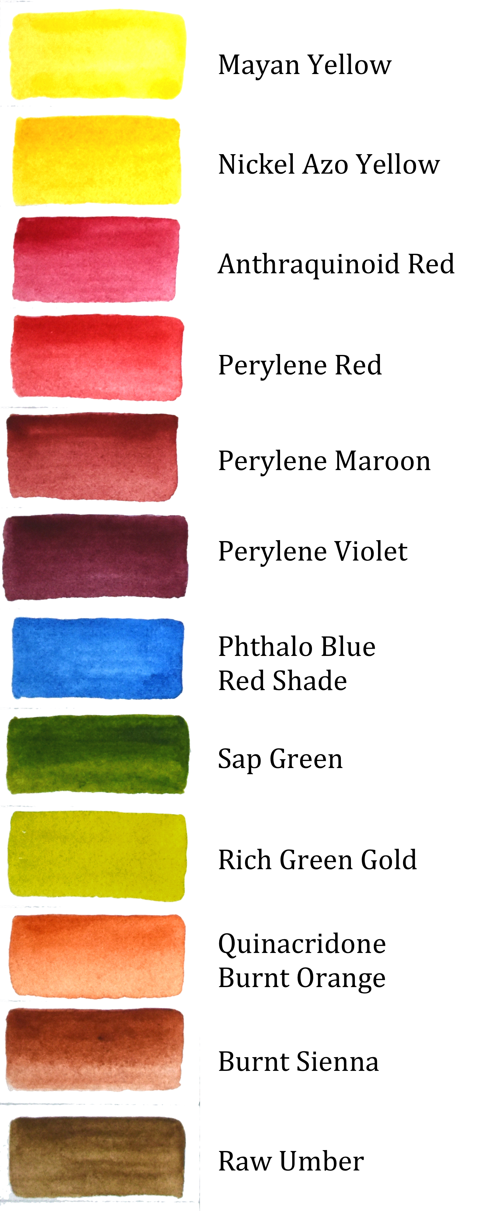 Going on with my autumnal streak, here are twelve colours I am playing with this year. The foliage colours are not as bright as we know they can be, because the trees got too hot and too dry for a long periods of time and they’re a bit stressed up as a result. Their leaves are quickly turning to dark muted reds and browns rather than lighter, brighter hues. So I chose a pale and a darker golden yellows, a crimson, three Perylenes, a non-granulating violet-biased blue, a muted green, a golden green, a russet brown, a still russety but more muted brown and a down to Earth greeny brown.