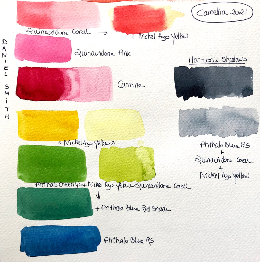 Here is the palette I used for the Camellia (all Daniel Smith paints).