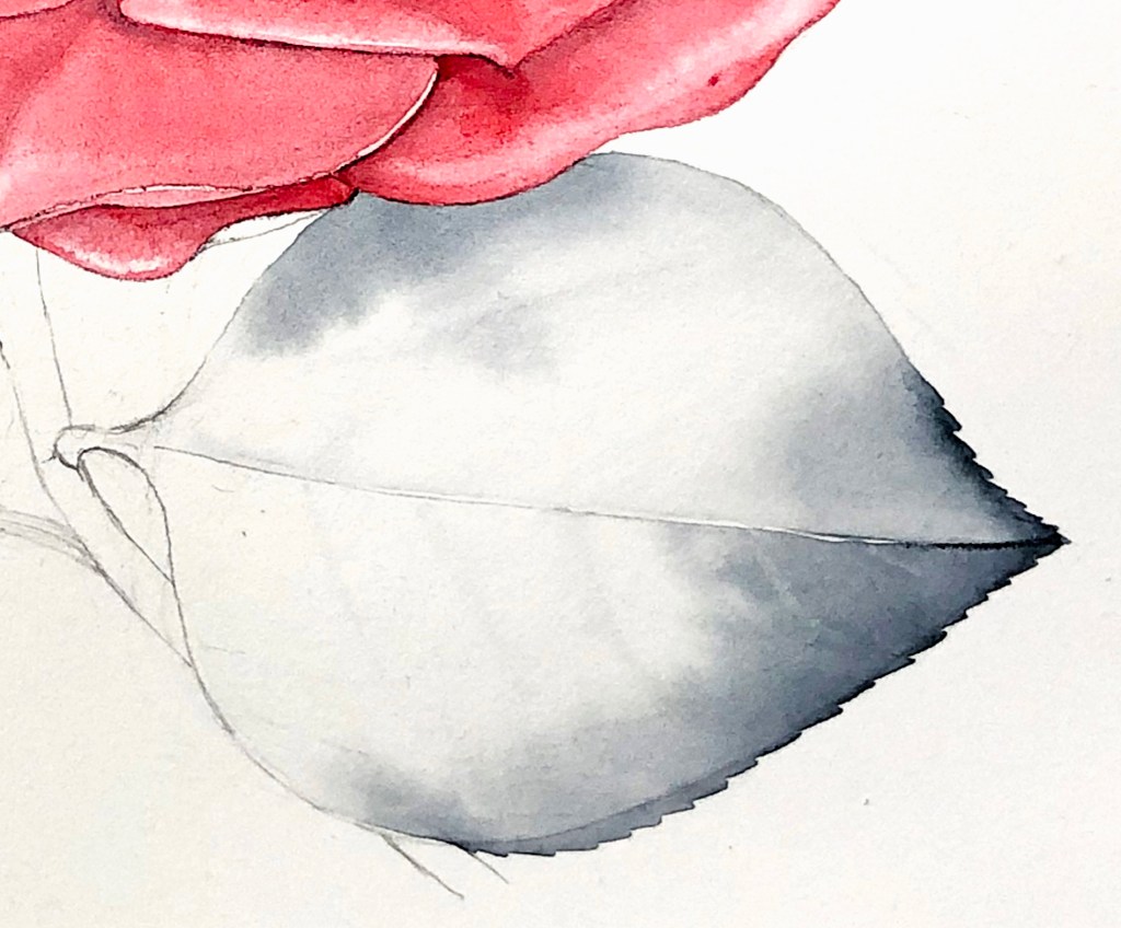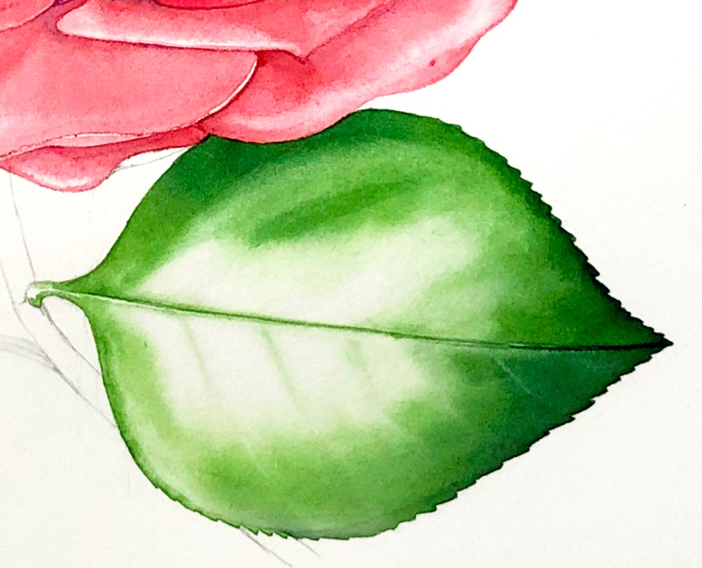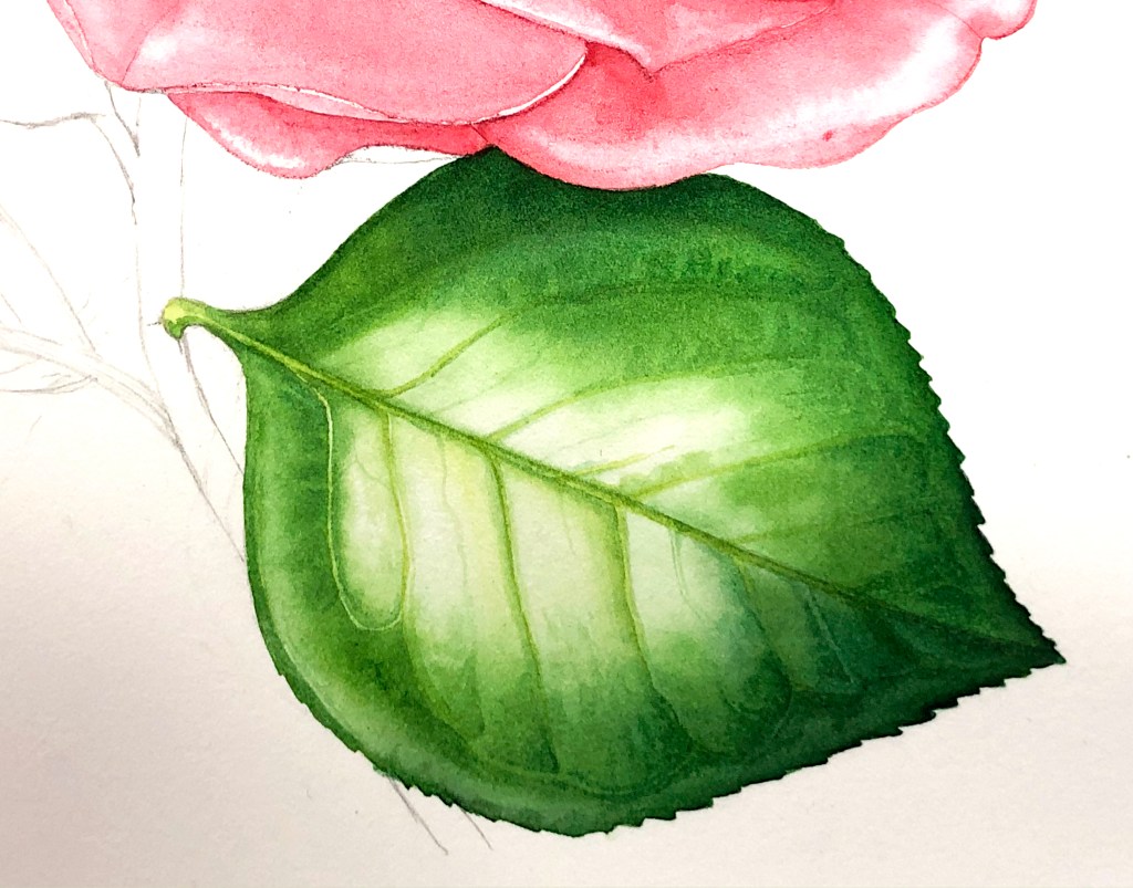 I always paint my leaves wet-on-wet but it is even more important for the shiny ones. Painting wet-on-wet avoids all hard lines within the shape and the strong highlights look soft and natural. A hard edge around a highlight would make it look like a hole in the leaf rather than a patch of light.