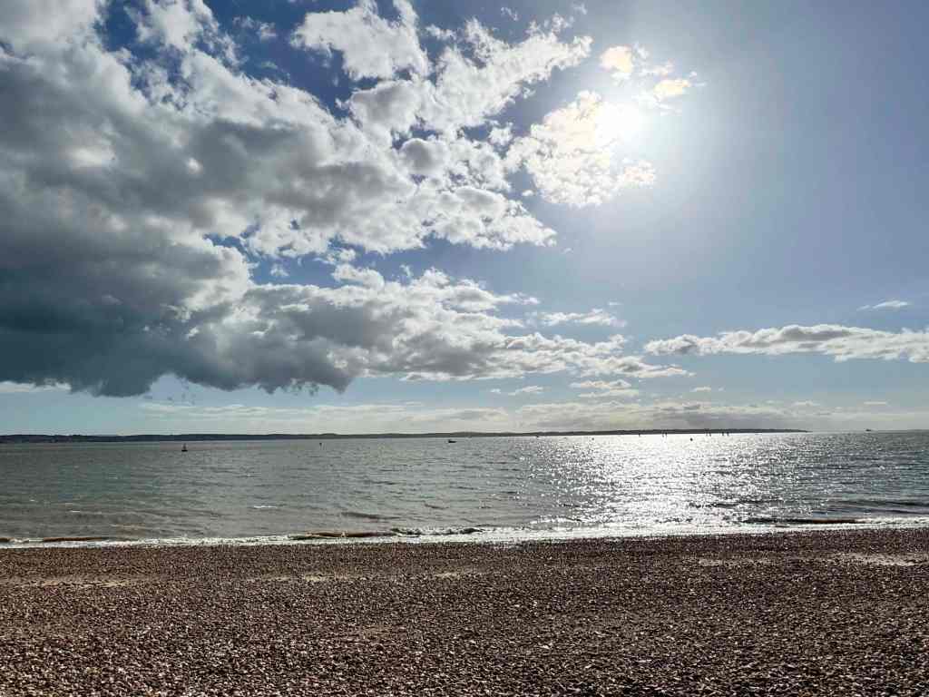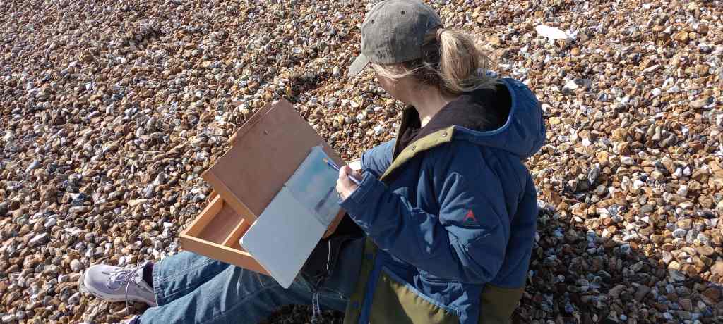 And we’re off to Stoke’s Bay, with views of the Isle of Wight across the Solent… Even on a very windy day on the beach, the box felt comfortable and stable on my lap while I was painting with paintbox in right hand and brush in left hand.