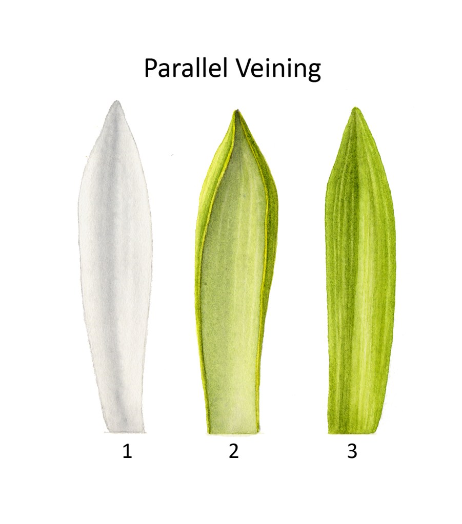 Parallel veining means that all veins run from base to tip, with no side veins branching out of the central vein. Although it is called parallel, it is not actually parallel. Parallel lines never touch. Parallel veins do touch at the tip, and in some cases also at the base. But they do run more or less parallel to each other if you don’t look too closely, and although they touch in places where the leaf gets narrower, they never cross.