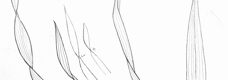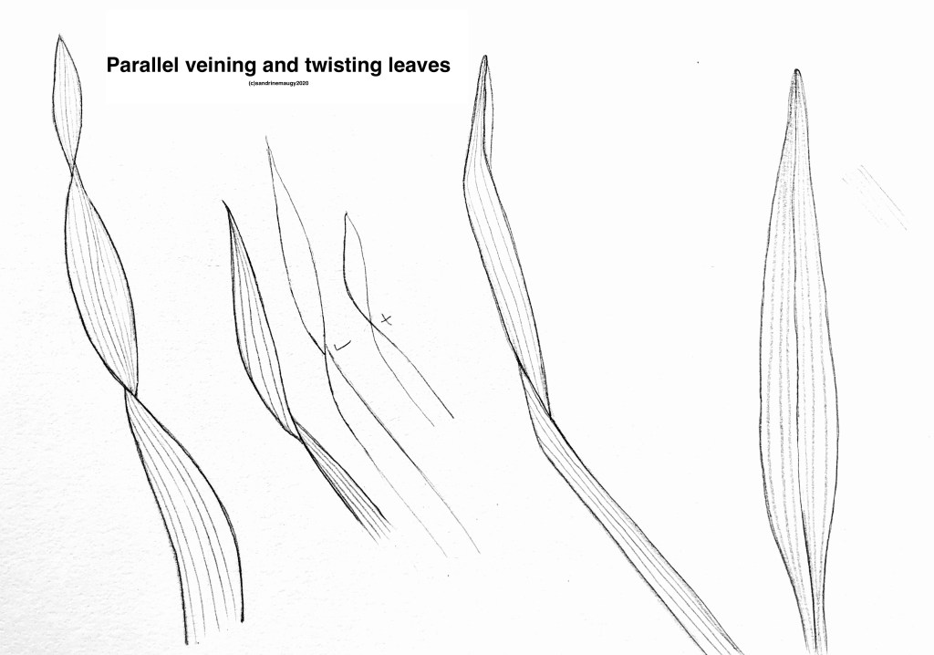 In this video I am showing how to draw these leaves and also how to draw these pesky twisting leaves. One mistake I see a lot is portraying the intersection as a perfect cross. This would be true if the leaf was two-dimensional. But every leaf has a thickness, thus being three-dimensional. This thickness needs to be shown, so the cross isn’t a perfect cross. It has a bit more added on the topside and on the underside. This tends to be especially true for these long leaves with parallel veining because they are usually thick, fleshy leaves, with more thickness than most foliage.